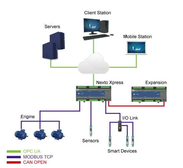 In the example, the implemented solution is responsible for control and supervision of the lighting, electrical and hydraulic processes of the building, optimizing its operation and reducing the high consumption of these resources. For this case, we indicated the use of an architecture where Nexto Xpress acts as a central controller, interacting with both the supervisory and field equipment. As it supports the main Ethernet communication protocols, the equipment can communicate directly with the SCADA system, providing data for decision making and receiving instructions through the OPC UA protocol. The feature also allows the controller to communicate directly with most relevant cloud hosting services on the market, such as Microsoft Azure, IBM Cloud, Google One and Amazon AWS.