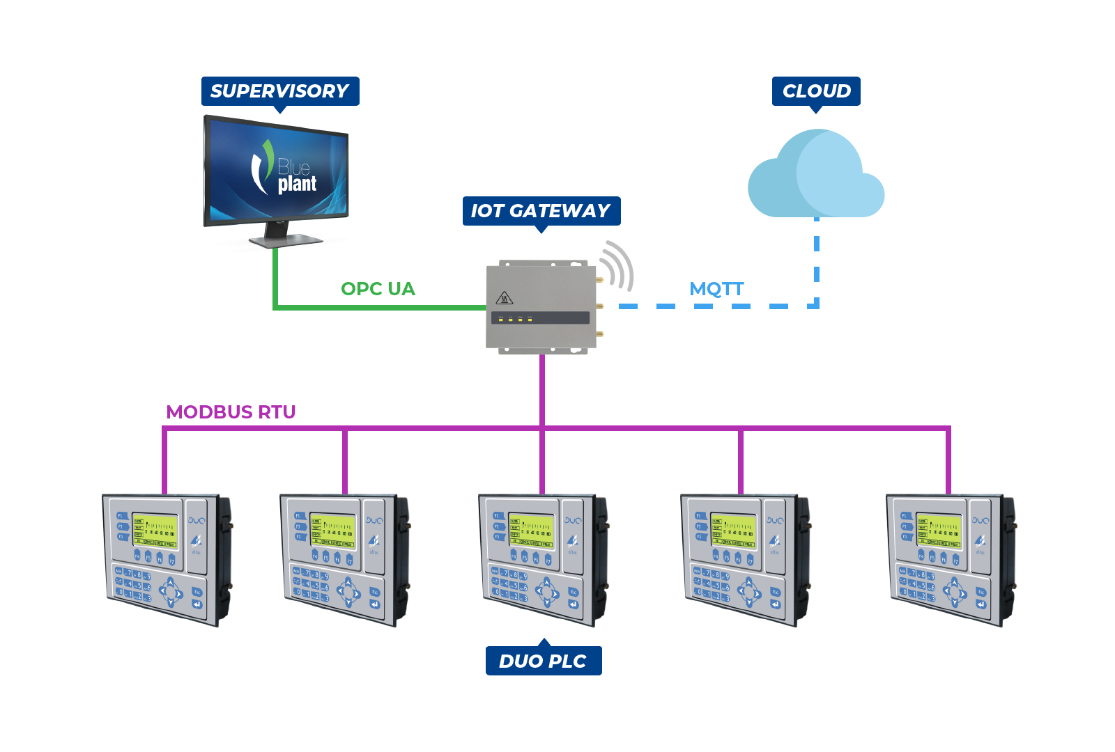 However, there is a problem: the DUO family devices communicate only through the protocol used in the control network, the MODBUS RTU, and also do not have Ethernet-type interfaces, only RS-485 and RS-232 serial ports. In this case, so that the new supervision system could be installed without major changes in the control architecture, an IoT gateway could be used as a translator between the PLC and the supervisory system. The equipment could receive data from the controller in MODBUS RTU, through one of the serial interfaces, and convert it to a language compatible with the supervisory, such as the OPC UA protocol.