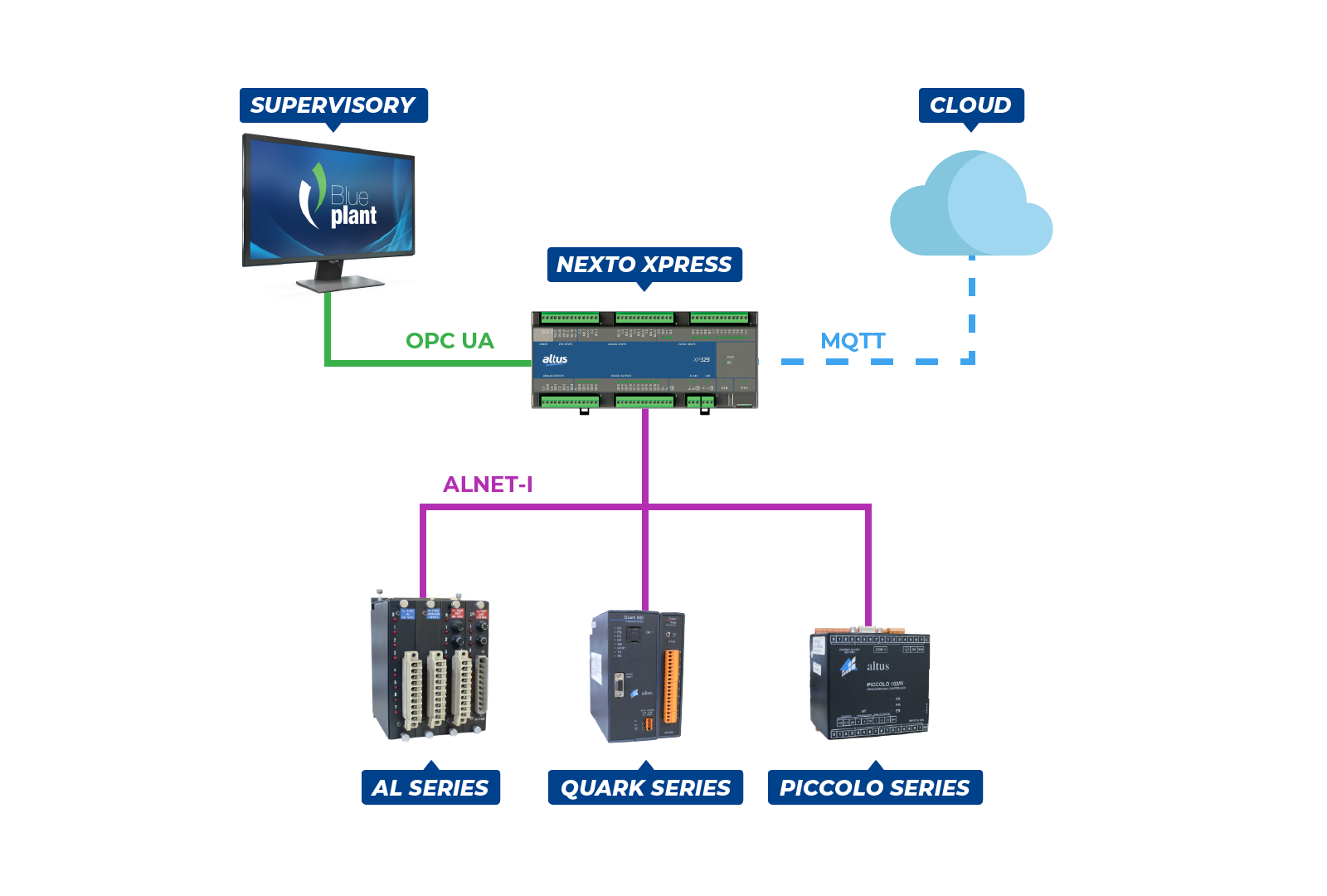 One example we can mention is the use of the PLC as an IoT gateway for communication between older Altus product families, such as the AL series, Quark and Piccolo, and new IoT devices. In this case, Xpress can translate the data sent by the equipment, which use the ALNET I standard, to EtherNet/IP or a more common protocol today. As in the previous example, the Nexto Xpress PLC could also transmit this data to a supervisory, using the OPC UA or MODBUS TCP protocols, and to a cloud database, using MQTT.