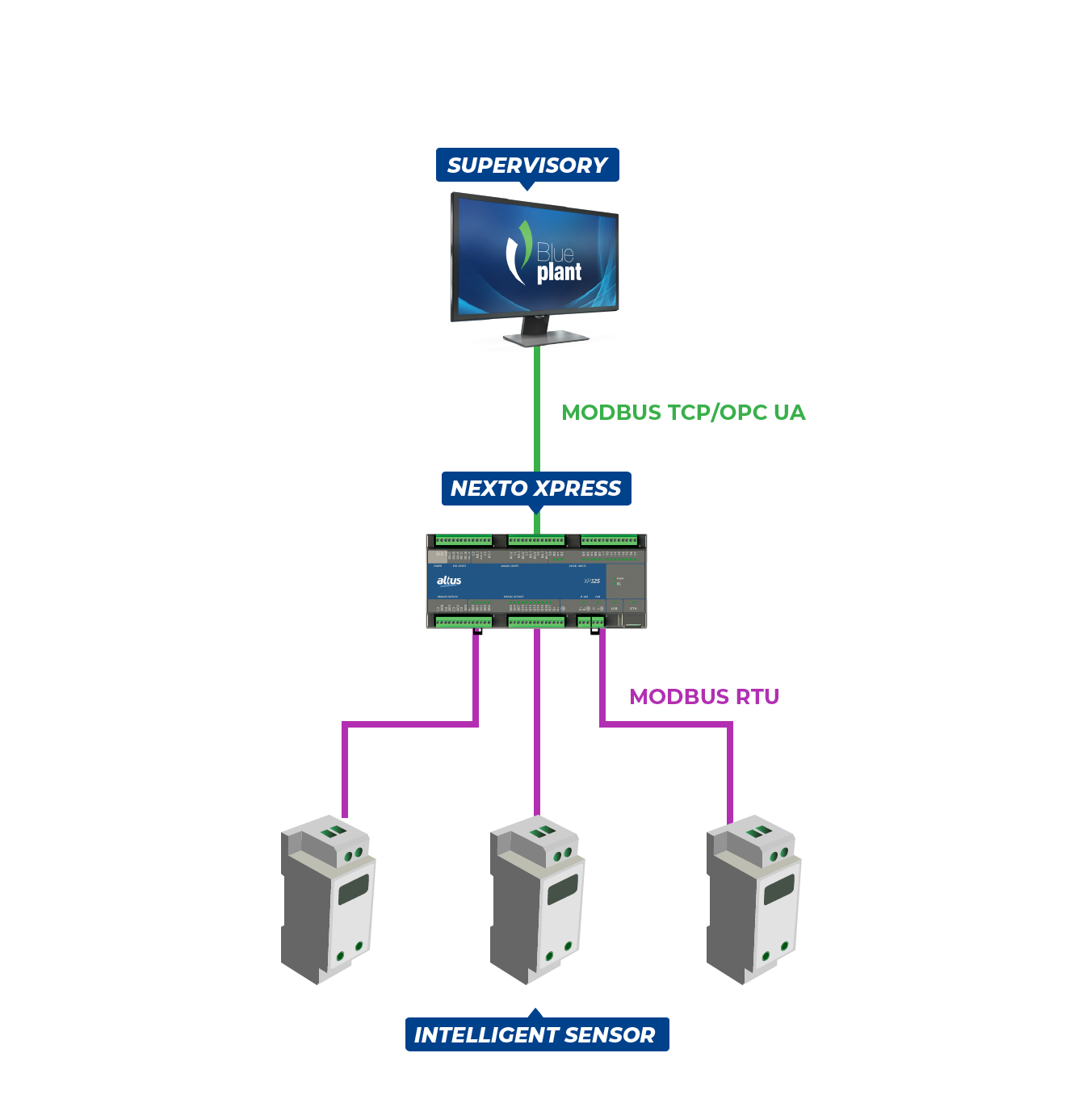 In addition, the Altus compact controller can also be used as a communication intermediary between smart sensors, actuators and the supervision system. As they have the capability to process the collected data, this type of field device can forward interpretable information directly to the supervisory resource. However, as these equipments usually only have serial type interfaces, with MODBUS RTU protocol, the Xpress PLC can perform the data conversion to MODBUS TCP or OPC UA standard and forward the information directly to the supervisory software.