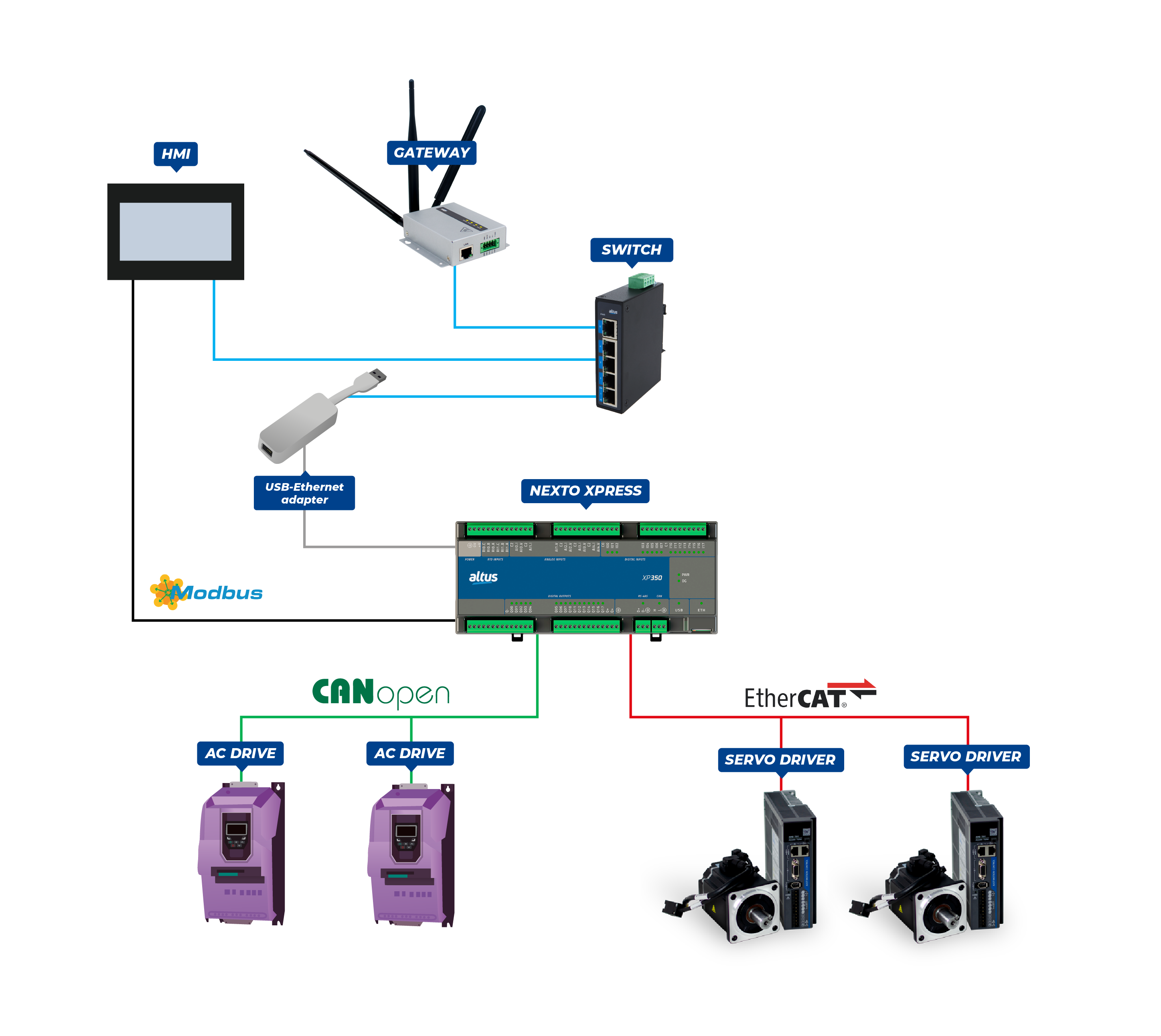 To achieve this goal, our OEM team specialists, part of Altus`s dedicated and customized technical-commercial team serving the machinery segment, developed a new control architecture using the PLC XP350, a model from the Nexto Xpress line that supports Motion Control.